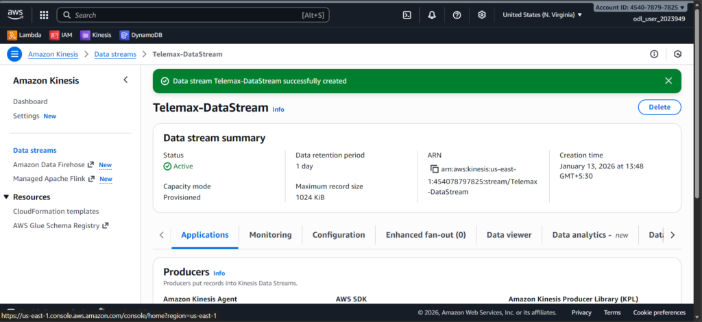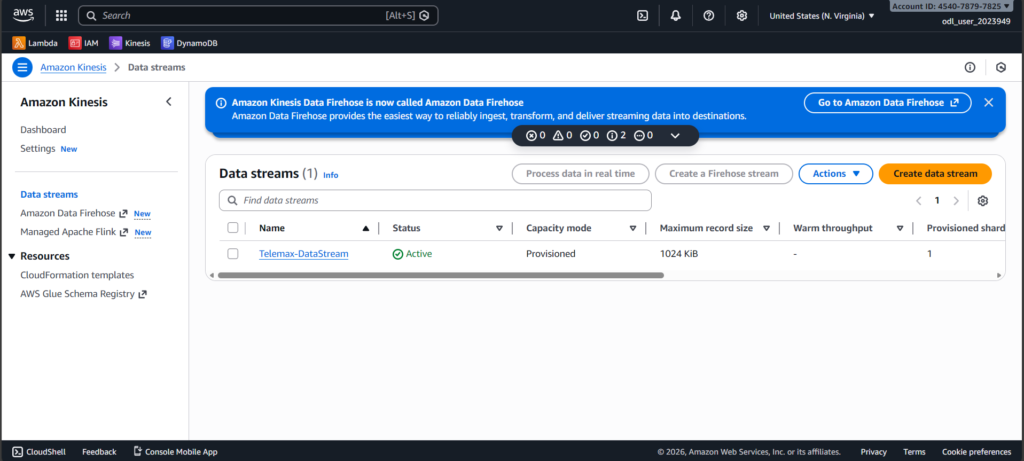 I started by creating a Kinesis stream to receive live incoming data. This stream acts like a pipeline that carries real-time data from devices into AWS.