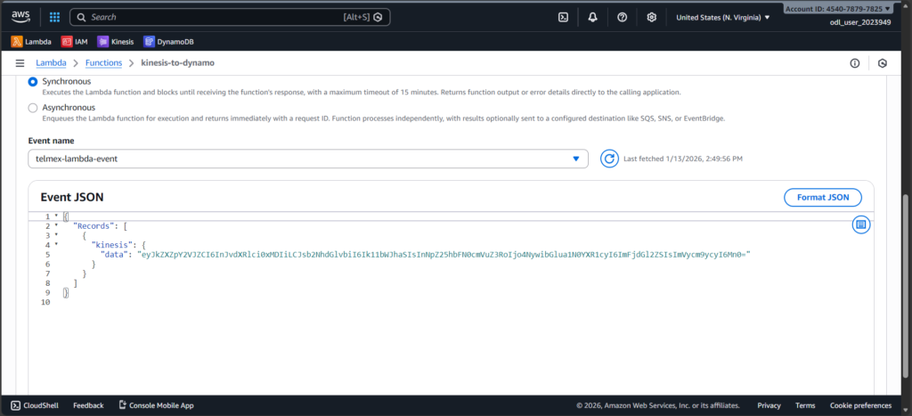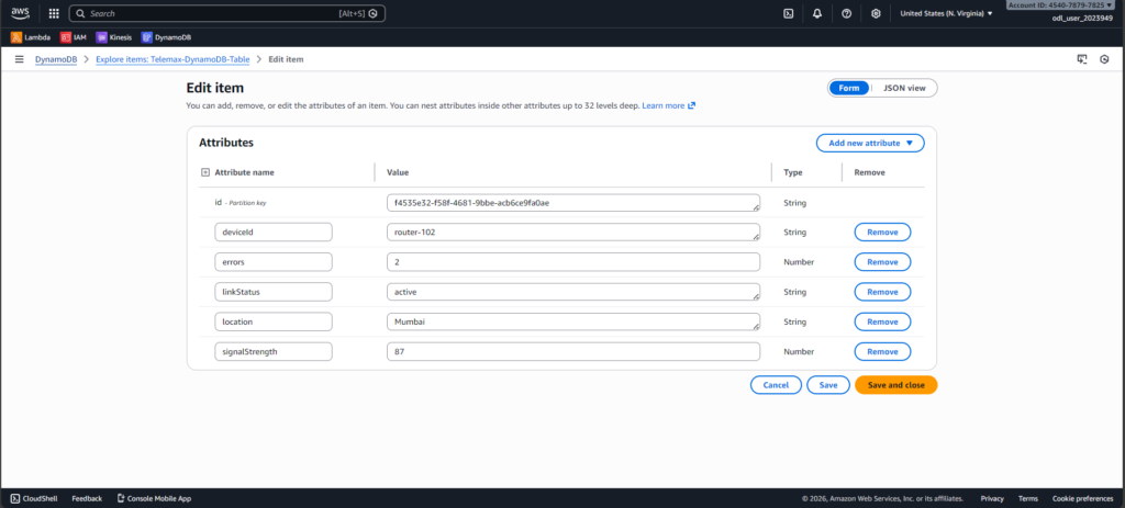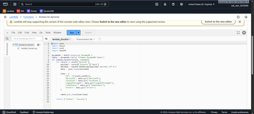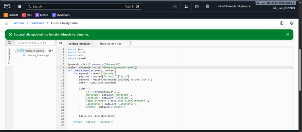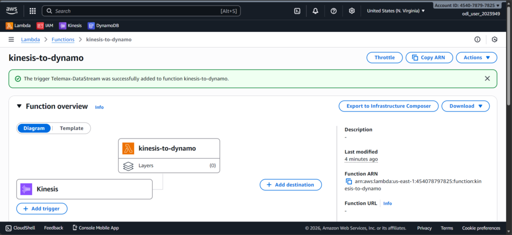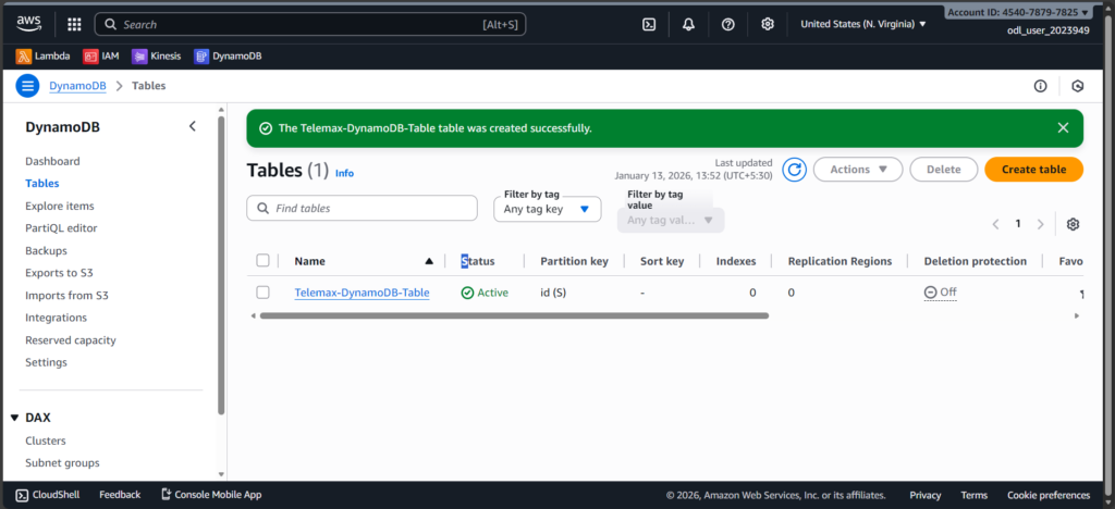First, I created a Kinesis Data Stream to receive live incoming data. Then I created a DynamoDB table named Telemax-DynamoDB-Table to store the processed information. I also created an IAM role to give Lambda permission to read from Kinesis and write to DynamoDB.