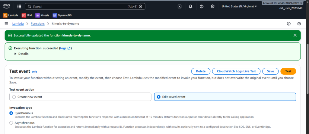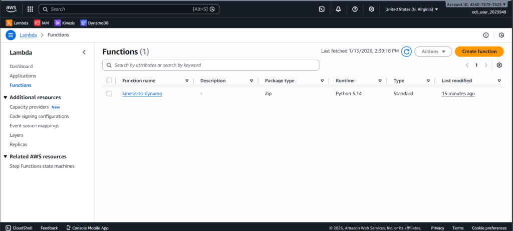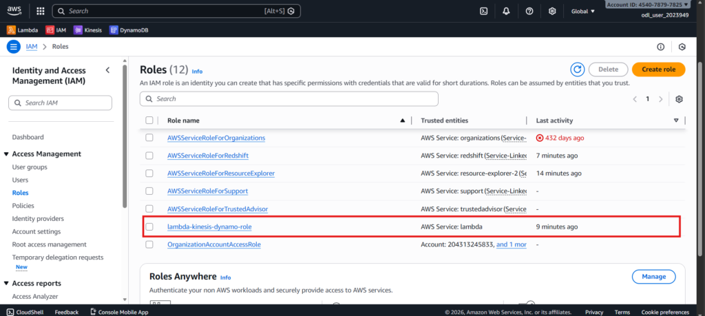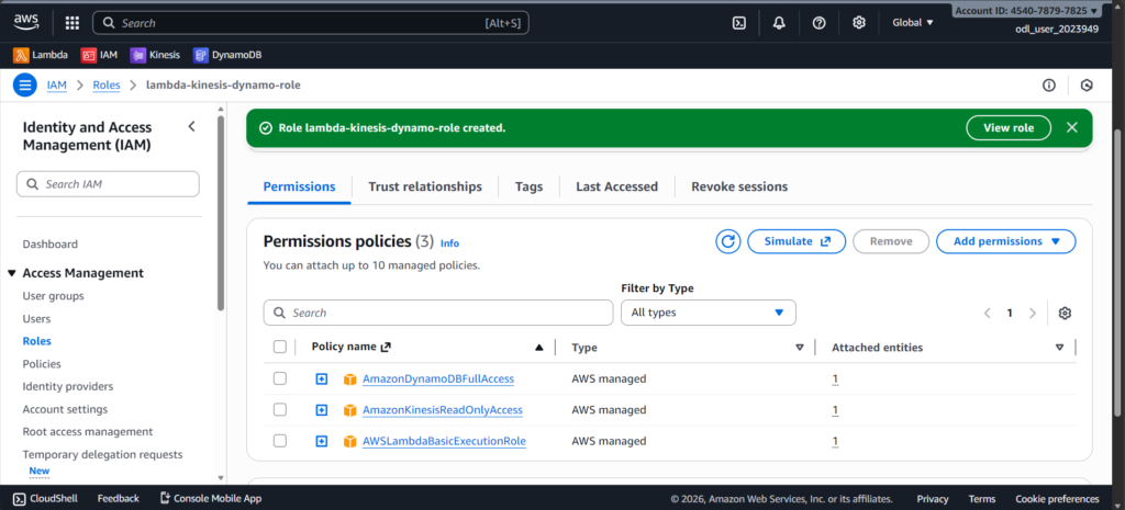 I created an IAM role that gives Lambda permission to read from Kinesis, write to DynamoDB, and generate logs. Without this role, Lambda wouldn’t have access to these services.